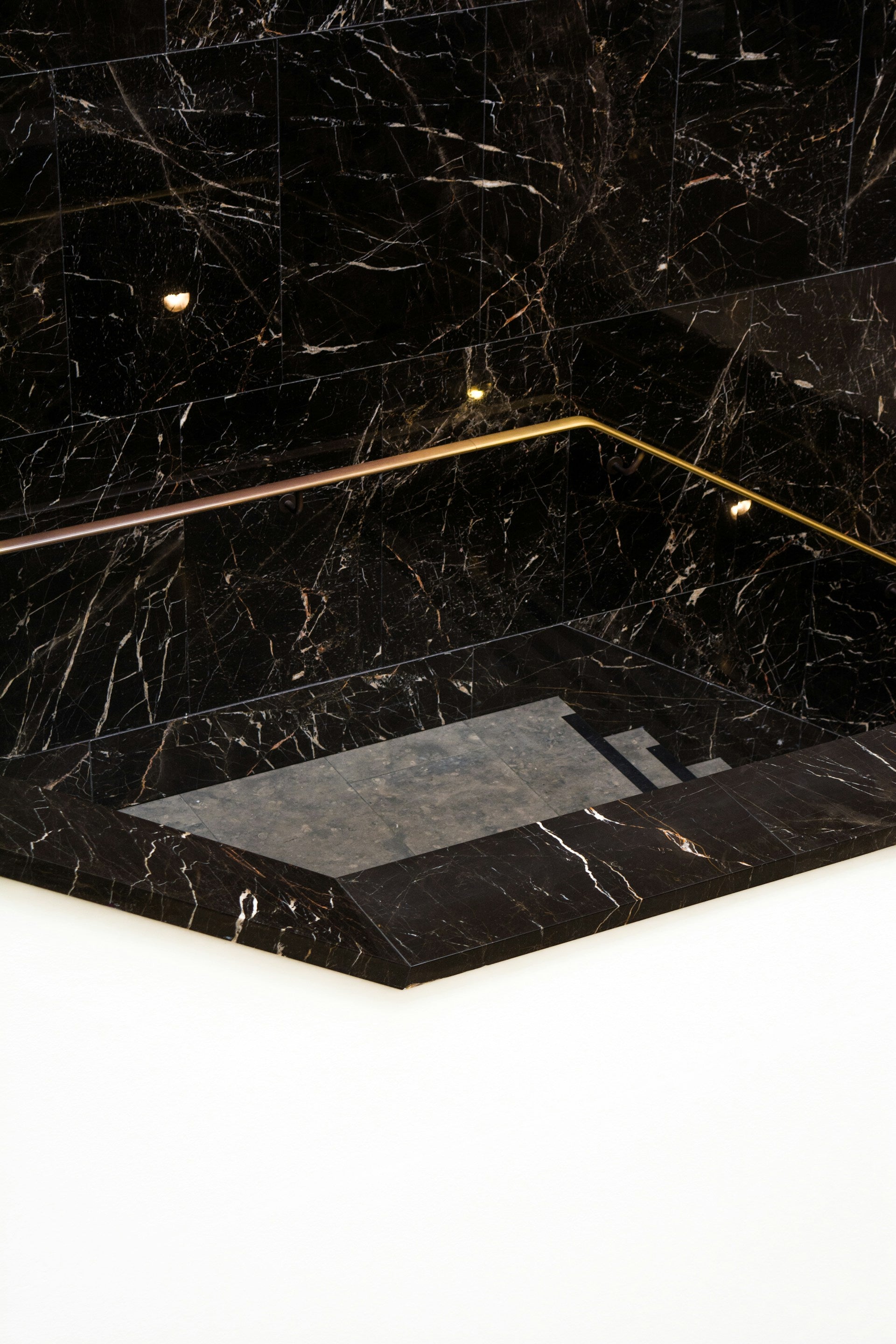 Bold and daring materials, solid brass metals, and sumptuous textures combine to form a captivating and intimate ambiance in this lavish half bathroom design. Each material was curated for maximum impact.