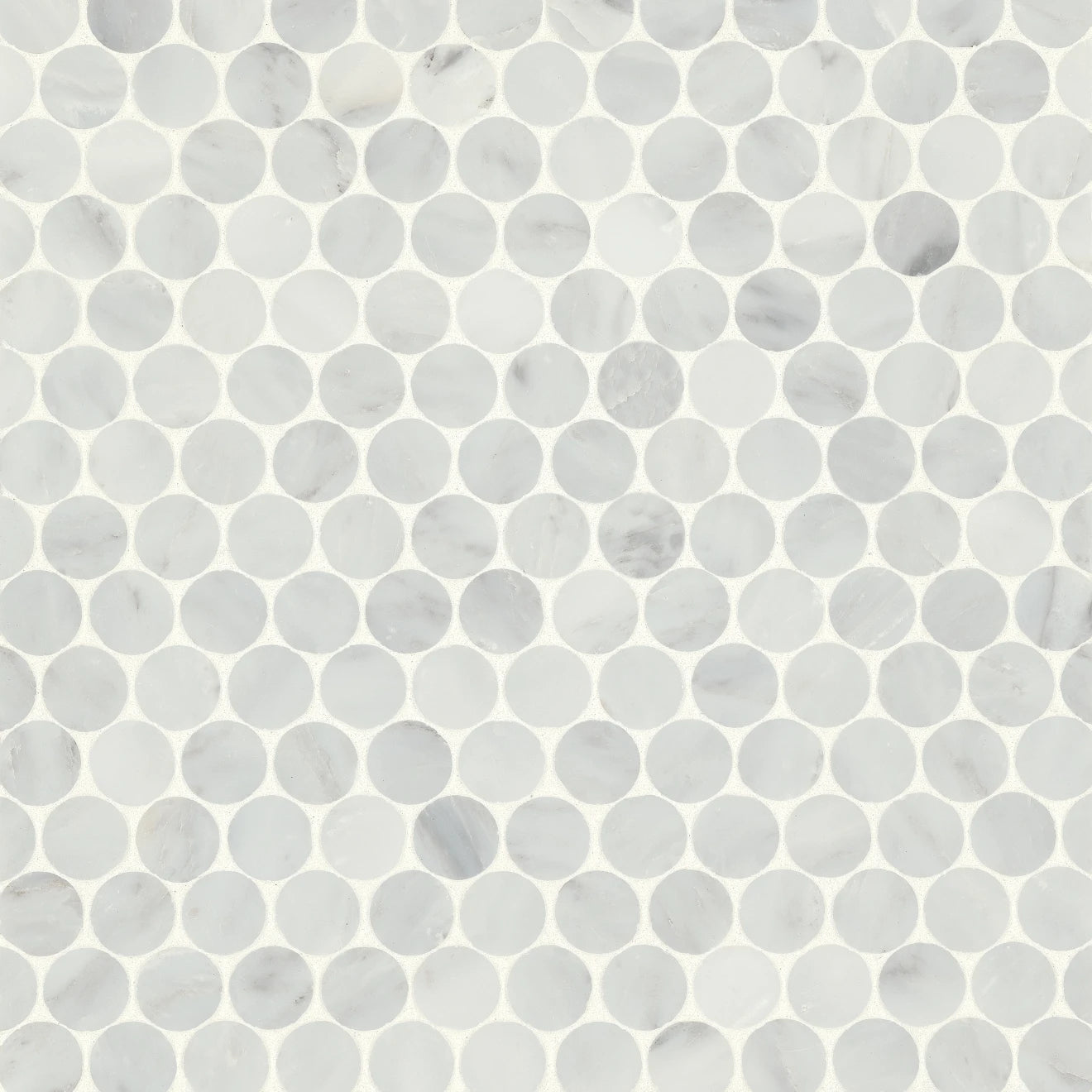- Symmetry is at the heart of this marble mosaic tile, which brings uniform depth to the space. The honed finish brings a soft, graceful feel to the surface.
